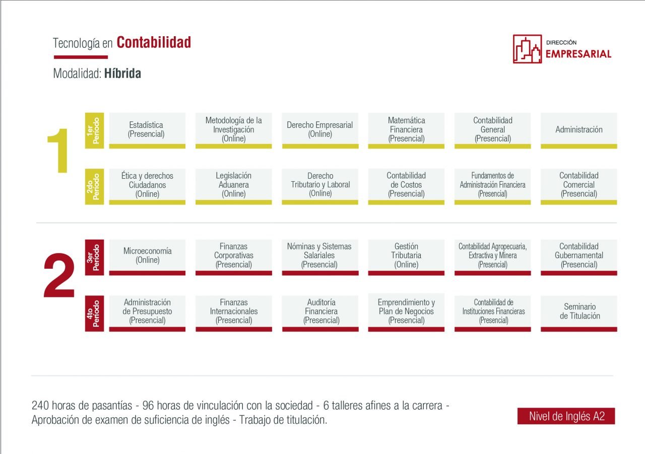 Bienvenidos a la carrera de Contabilidad donde serás la pieza clave para la toma de decisiones en las empresas, desarrollando el control y análisis de los procesos que generen información financiera en los sectores de su influencia, utilizando la comunicación verbal y no verbal, tecnologías de la información y procesos de investigación de fuente nacional o internacional.