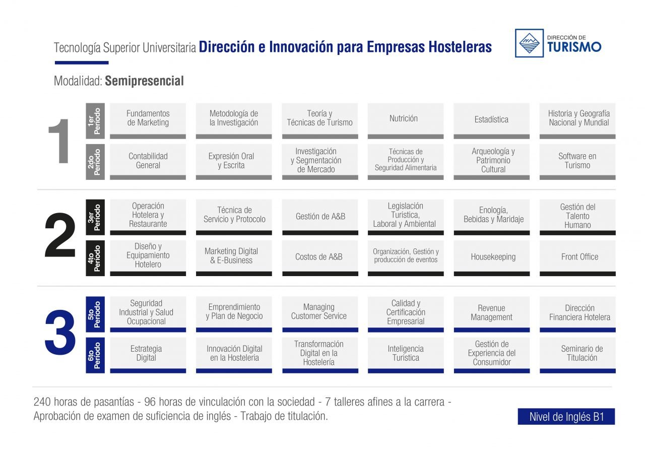 Bienvenidos a la carrera de Dirección e Innovación para Empresas Hosteleras donde la innovación y la creatividad te llevan a enfrentar los grandes deseos de clientes exigentes. Utiliza las tecnologías de la información y de la comunicación en los distintos ámbitos del sector hotelero, permitiendo implementar buenas prácticas hoteleras, en un ambiente apropiado y creativo, satisfaciendo las necesidades del cliente interno y externo.
